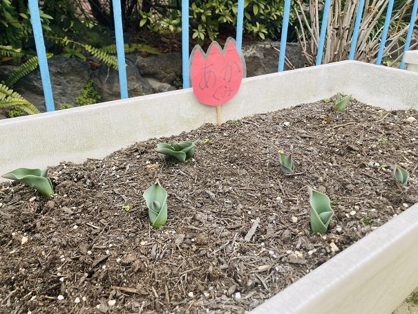 園庭のスイレンがきれいに咲き、チューリップの芽が続々と顔を出し始めました。