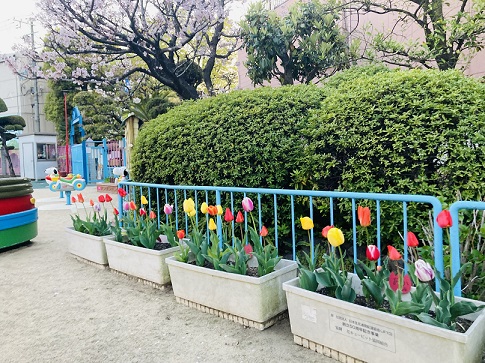 4月8日は始業式、園庭のチューリップも色鮮やかに咲き、1年の幕開けを告げているようです。