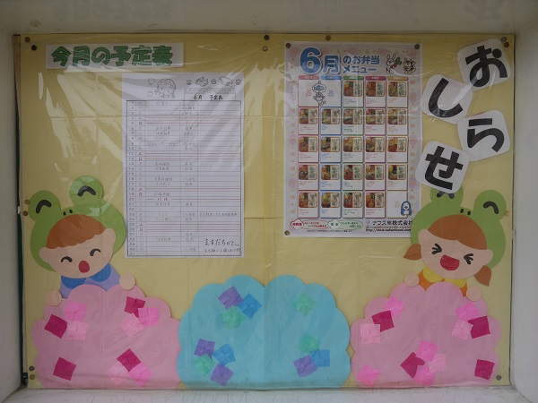 製作、絵本読み、歌、リズム遊び、手遊び、体操(火曜日)、自由遊びなど