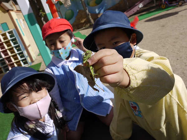 秋から冬へと移り行く中で、雲や園庭の木々、昆虫などを見つけては、自然を肌で感じているようです。