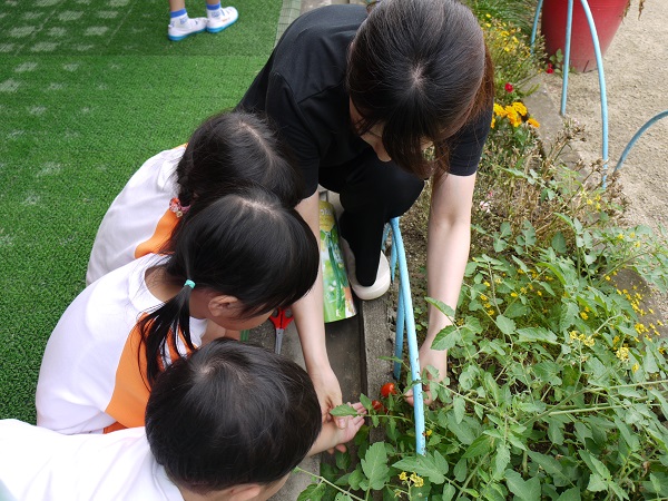 ももぐみさんのお部屋の前のミニトマトが少しずつ赤くなってきました。