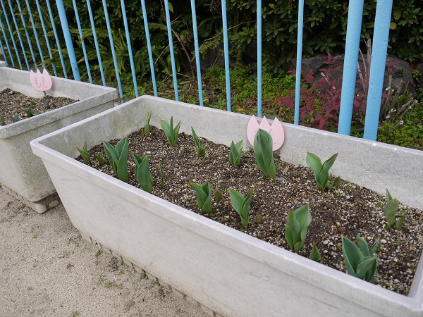 園庭では、子どもたちが植えたチューリップの芽が続々と顔を出し始めました。