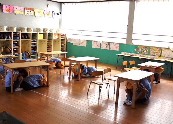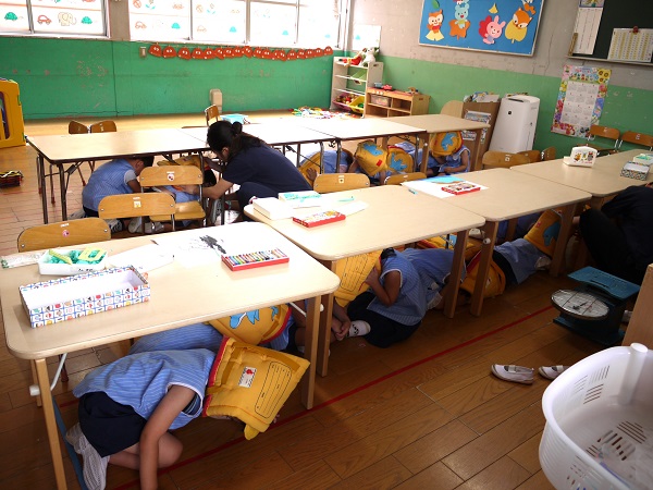 サイレンの音にびっくりして泣き出してしまうお友だちもいましたが、みんな慌てず、落ち着いて机の下に潜ることができました!