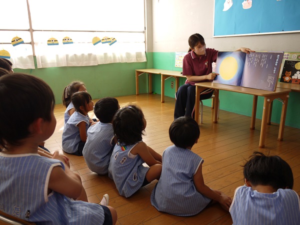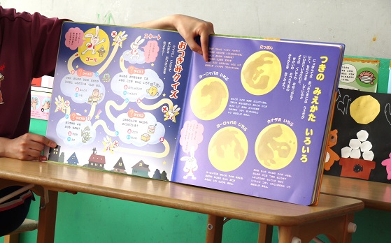 お部屋には、すすきや紙で作ったおだんごが飾られ、先生からお月見のお話を聞いた子どもたち。