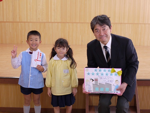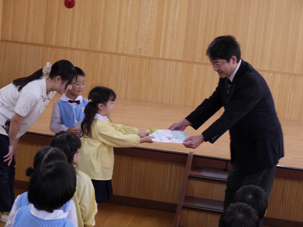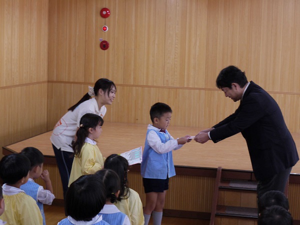 工場長さんが来園され、目録をいただいた後は、子どもたちからありがとうの気持ちを込めた製作をお渡ししました(^^)
