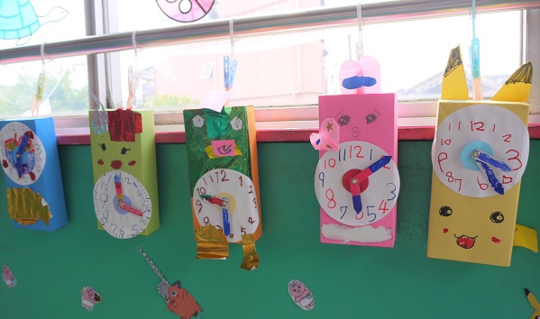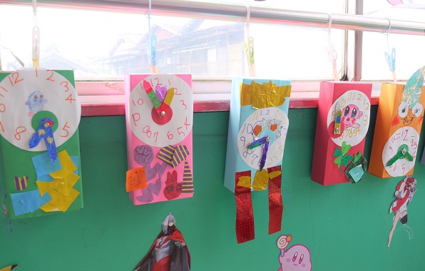 年中・年長クラスでは、「長い針が5になったらお片づけだよ」などと、子どもたちも時計の見方がわかるようになってきたようです(^^)