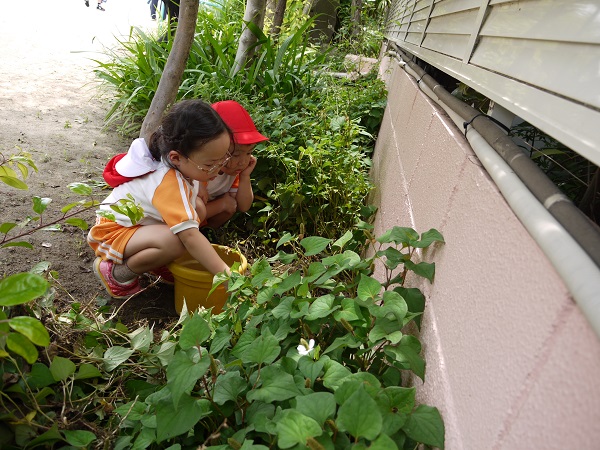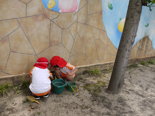 お外遊びの時間には、園庭のあちこちでダンゴムシを探すほほえましい姿が見られます(^^)