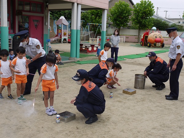 大正消防署の消防士さんが来園され、消防花火教室を開催しました。