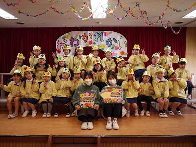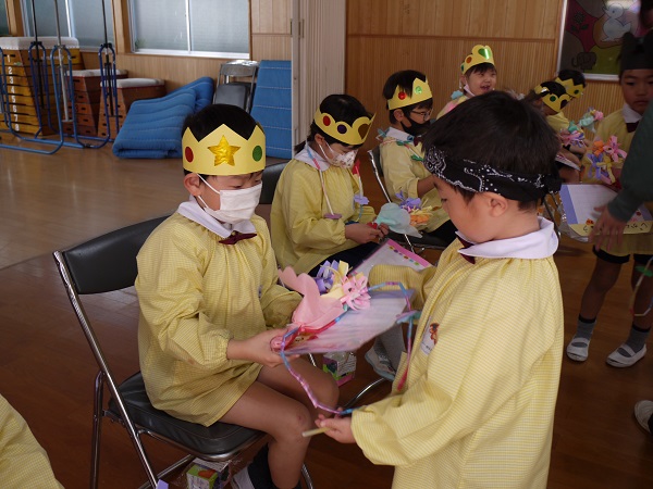 最後には、年長さんから年少・年中クラスのお友だちや先生たちみんなにお返しのプレゼントを渡しました♪