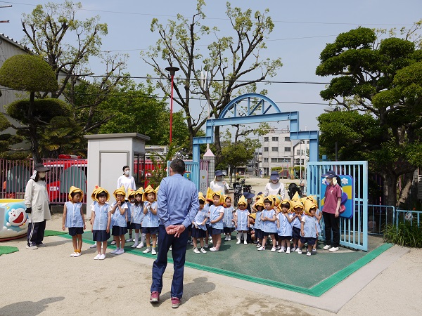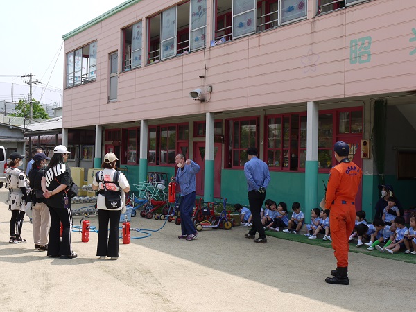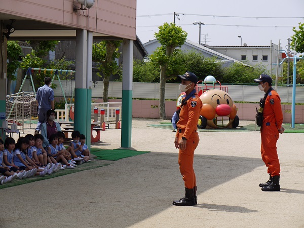 大正消防署から消防士の方が来園され、消防避難訓練を行いました。