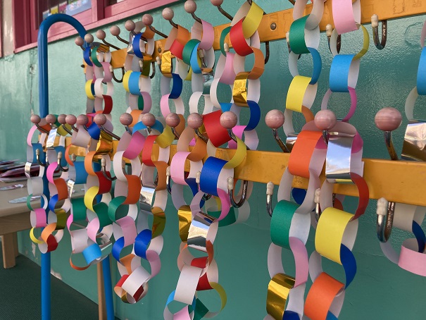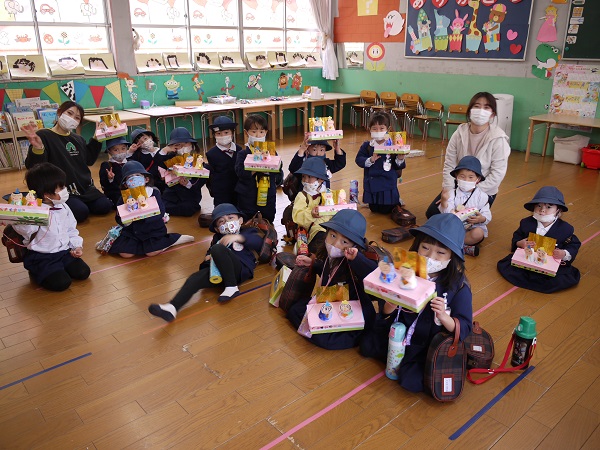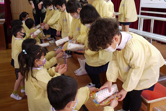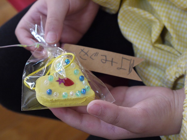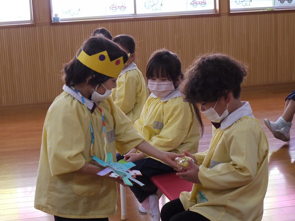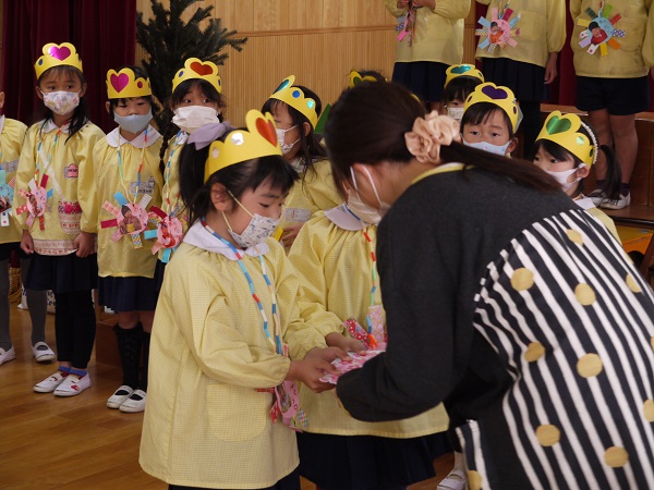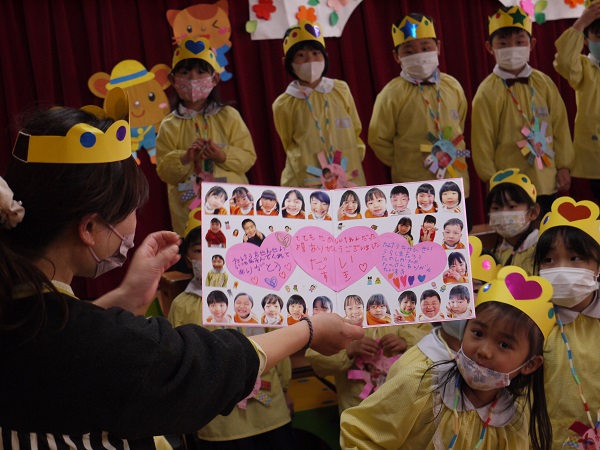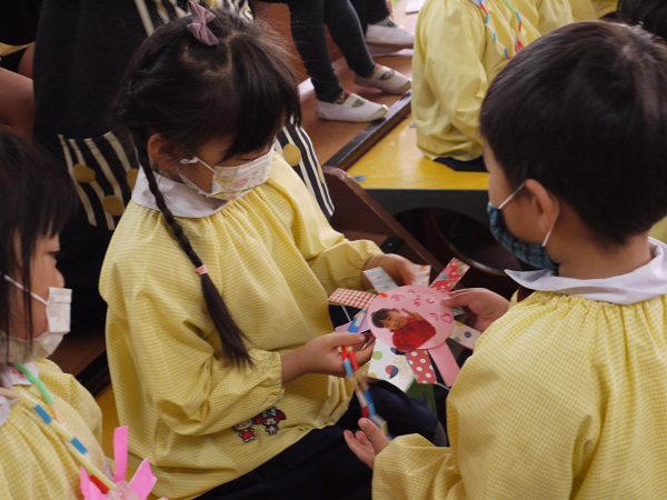 年少さん・年中さんとそれぞれ手作りのプレゼント交換をした後は、“たくさんあそんでくれてありがとう”のかわいいメッセージも(^^♪