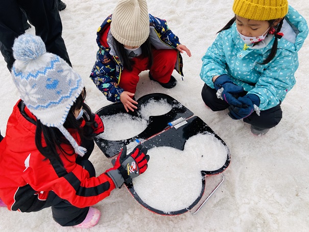 午前中はそり滑り、お昼ご飯の後は、雪だるまを作って雪遊びを楽しみました。