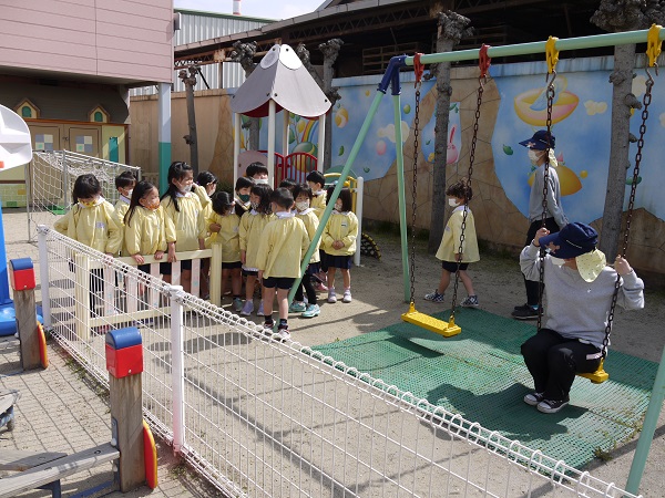 お外あそびをするために、園庭にある遊具の正しい使い方を学ぶ時間です(^^)