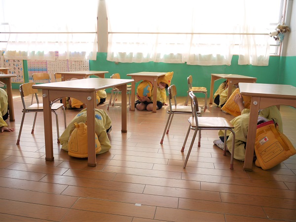 保育中、サイレンが鳴ると防災頭巾を被り、机の下に避難します。