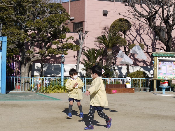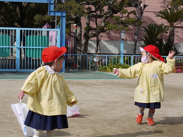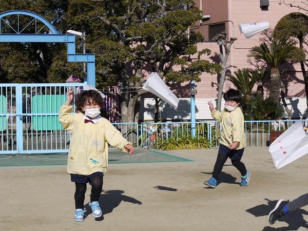 寒い日も園庭へ飛び出して、「わーい!あがった〜!」「あれ、落ちちゃった〜!」と、元気な声を響かせながら、北風と一緒になって走り回っている子どもたち(^o^)