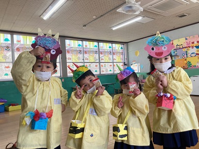 各クラス自分で作った色とりどりのお面にますを持って、おにを追い払おうと意気込む子どもたち(^^)