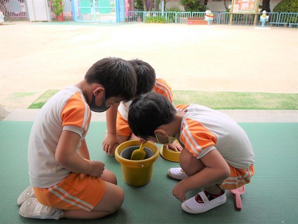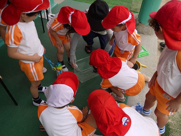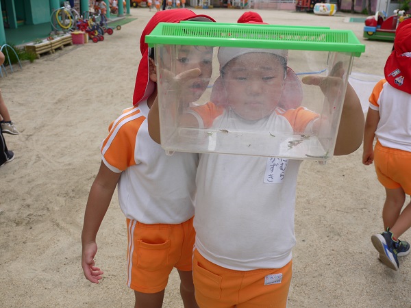 園庭では、変わらず子どもたちが元気に汗いっぱいの姿で駆け回っていますが、遊びの中でコオロギを発見し、みんな興味津々です!!