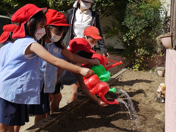 色とりどりのチューリップが咲くことを願って、みんなこれから水やりしていこうね!