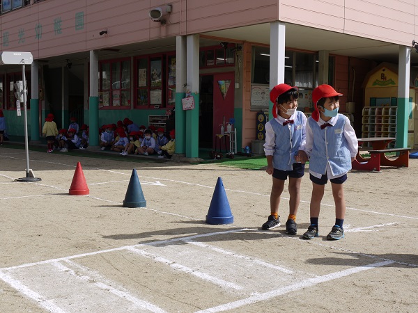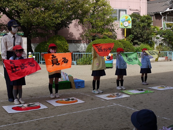 正しい横断歩道の渡り方や、交通ルールについてクイズ形式で教わった後は、園庭に描いた道路を実際に渡る練習です!