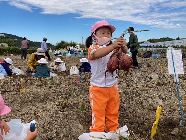 お友だちや先生と一緒に土に触れて、自分の手で秋の実りを収穫する喜びを味わってくれたようです(^^)
