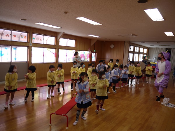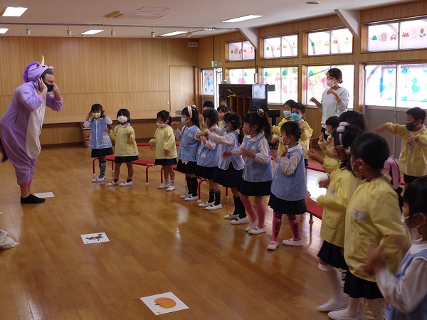 いつもと違ったユニコーンの仮装をした先生が登場すると、子どもたちは大盛り上がり(^^)