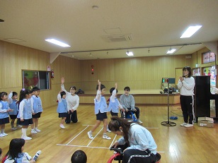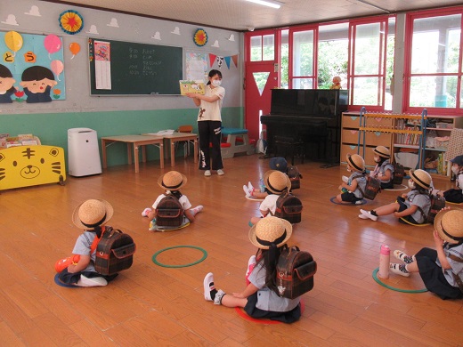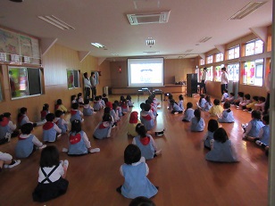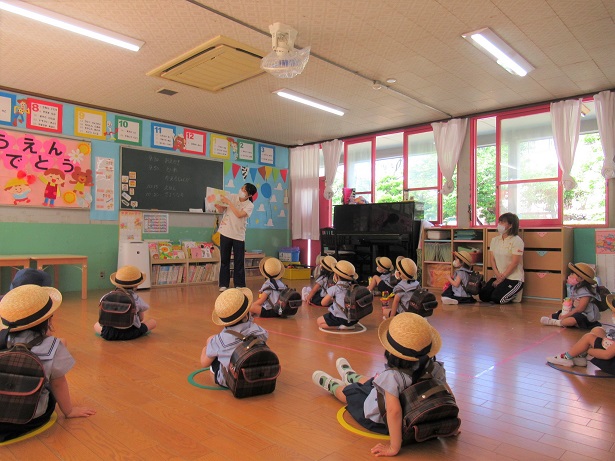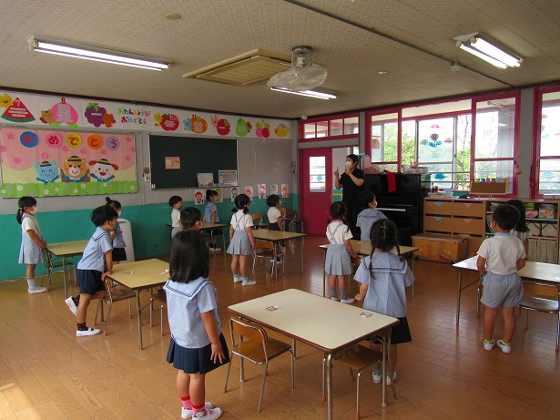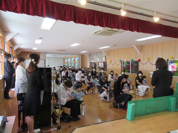 急な雨の為、園庭ではなく、密を避けてお遊戯室での開催となりました。