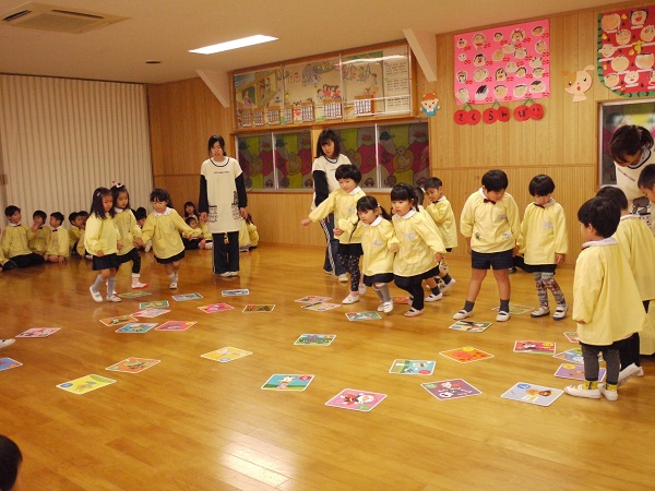 お誕生会の後は、縦割りクラスのチームで大きなかるたとり大会をしました。