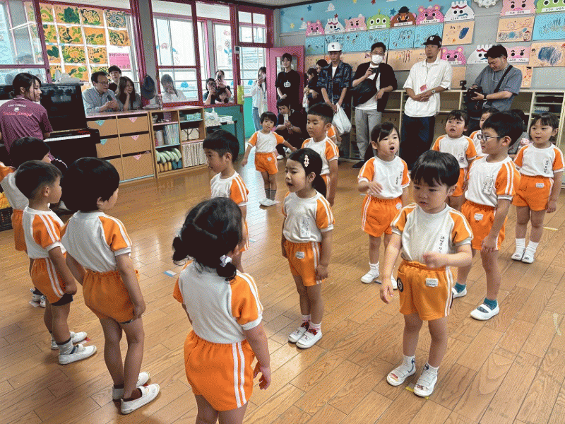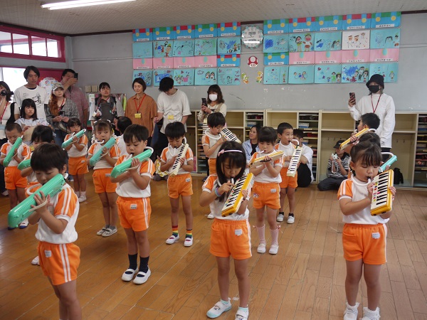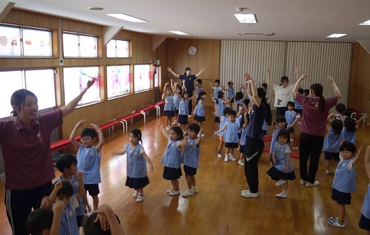 いつもの朝の会やおうたなど、お部屋での様子をみてもらい少し緊張気味の子ども達でしたが、親子の触れ合い体操になると満面な笑顔で楽しんでいました。