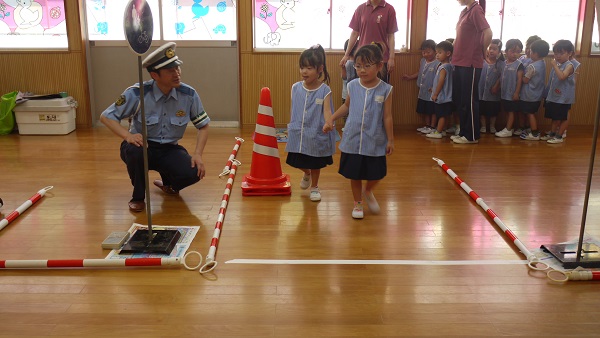 正しい横断歩道の渡り方や、交通ルールについて教わった後は、お遊戯室に準備した道路を実際に渡る練習です!!