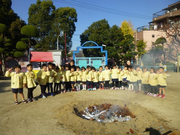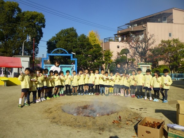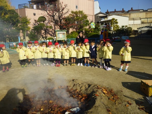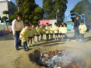 園庭で炭をおこし、子どもたちが集めた落ち葉で焼き芋大会。