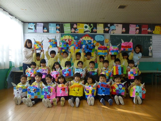 子どもたちが作ったカラフルな鬼のお面をかぶって、