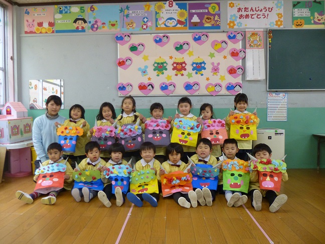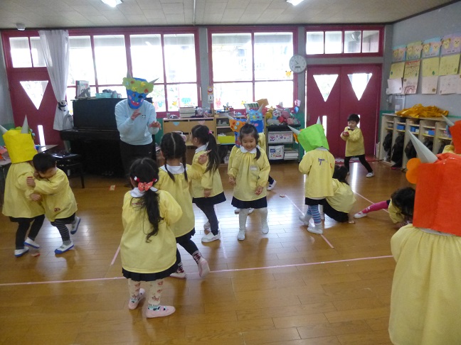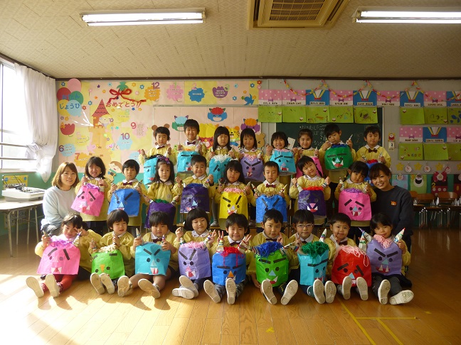 「おにはそと〜!ふくはうち〜!」と大きなかけ声とともに豆まきを楽しんでいました♪