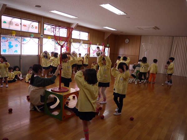 お天気が悪くお遊戯室で、分散の参観になりました。