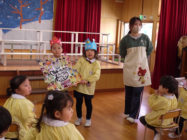 年少さん・年中さんとそれぞれ手作りのプレゼント交換をした後は、“たくさんあそんでくれてありがとう”のかわいいメッセージも(^^♪