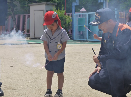 年長クラスのお友だちは、消防士さんから一人ずつ手持ち花火の持ち方も教えていただきました!
