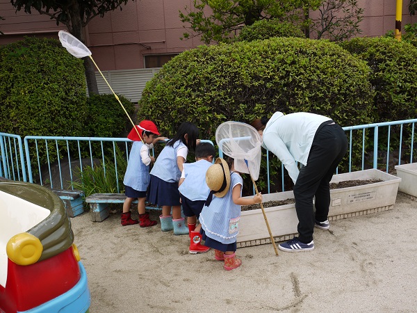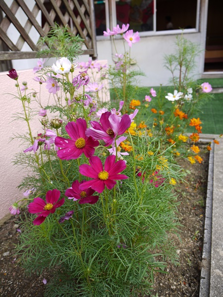 園では、コスモスが咲き、子どもたちが虫取り網を持ってとんぼやコオロギを追いかける姿が見られ、少しずつ秋が近づいてきているようです(^^)