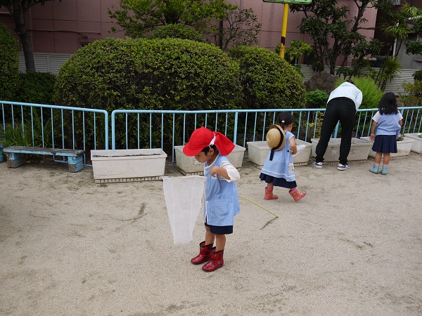 「赤色がいい!」「ピンクがいい!」と口々に言い合った後は、やさしく土をかぶせて、水やりをして、みんな真剣な表情です(^^)